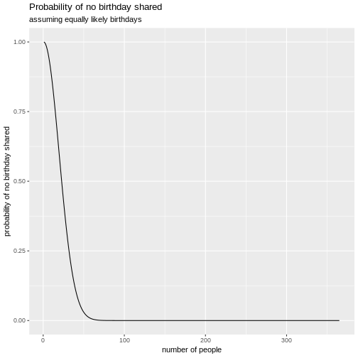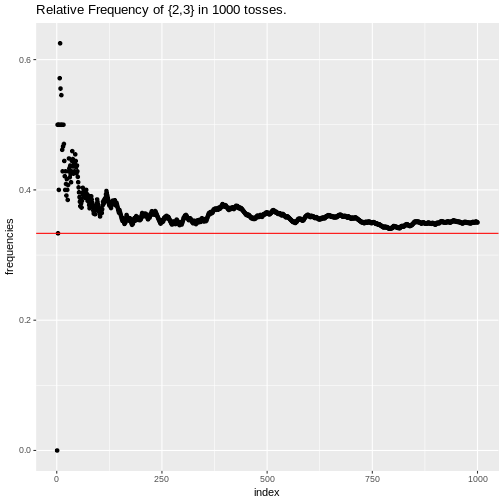 class: center, middle, inverse, title-slide # Introduction to Probability ### Sebastian Hoyos-Torres --- ## Outline: - In this section, we will cover the following: - Sample Spaces and Events - Properties, Axioms and Interpretations of Probability - Definitions of Probability - Equally likely probability spaces and counting techniques - Conditional Probability - Independence --- ## The Uncertain World - Often, we are faced with questions of uncertainty. For example; - How likely is it that you win the powerball? - If you intend to have children until you have at least one child of each sex then how many children will you have on average? - How many traffic lights will be red on your trip to the store? --- ## Key Terms - **Experiment**: any action or process where the outcome is subject to uncertainty. - **Sample Space**: Set of all possible outcomes of an **experiment**. - **Note**: Size of the set is NOT the sample space - **Event**: any subset of a sample space. - **Simple Event**: event consisting of a single outcome. - **Compound Event**: Consists of more than one outcome. - **Probability Function**: gives the probability for each outcome within the sample space. --- #Some useful notation to keep in mind in this section - `\(\Omega\)` : indicates the sample space. Also can be denoted as S or U - `\(\in\)` :Indicates that an element is a member of a set (e.g `\(a \in \Omega\)`) - `\(\emptyset\)`: Indicates the empty set in set theory. In probability, it is known as the empty event. Also known as the **impossible event** - `\(\cup\)`: Indicates a union between elements. For example `\(A \cup B\)` reads as "A or B" - `\(\cap\)` Indicates an intersection between elements. For example `\(A \cap B\)` reads as "A and B" - `\(A^C\)`: Indicates a compement.In this case it would indicate "the elements not in A" - `\(|\)` : Reads as "Given" --- ## Examples - To understand the definitons better, let's see a few examples - Tossing a coin. Within a coin flip, there are 2 possible outcomes. The **sample space ** in this example is {H,T}. In this case a *simple event* will be {H}. - This changes when you toss a coin twice. Instead of {H,T}, now you can have {0,1,2} corresponding to the number of heads appearing. Another is {HH,HT,TH,TH} corresponding to the first, second toss. In this sample space, the event of getting one heads can be represented by {HT,TH} - Let Y mean you scored in the 85th percentile and N mean you did not. The sample space in this case would be an infinite discrete on with {Y,NY,NNY,...} - However, the even you do not take the GRE more than 3 times would look like {Y,NY,NNY} --- ## Examples: Cont - Consider choosing a random strand of hair from the interval `\(S = (0,100)\)` . What would be some possible events? - In this example, which is infinite and continuous, we could say some possible events are `\(A = {{x|0 \le x \le 1}}\)` which is a **compound event** or `\(B = {10.55}\)` which is a simple event. - **Important**: Sample Spaces can be finite and discrete, infinite and discrete, or infinite and continuous. --- ## Approaches to probability - We are familiar with some approaches to probability. Among the most common are the following - Personal Opinion Approach - relative frequency approach `$$P(A) = \frac{N(A)}{n}$$` - The Classical approach `$$P(A) = \frac{N(A)}{N(S)}$$` --- ## Relative Frequency vs. classical approaches to probability - With Relative frequency, we are typically concerned with counts. For example, if we tossed a six sided die 1000 times, how many times would we get `\(E = \{2,3\}\)` ```r library(tidyverse) E <- c(2,3) #set up the event n <- 1000 #sample rolldie <- function(n){ sample(1:6,n, rep = T) } result1 <- rolldie(n) sum(result1 %in% E) #This will give you the number of times E occurred ``` ``` ## [1] 350 ``` ```r table(result1)# see a table of the results. These shouldn't vary too much ``` ``` ## result1 ## 1 2 3 4 5 6 ## 152 179 171 176 151 171 ``` --- ## Visual of the relative frequency approach <!-- --> --- ## Relative vs classical cont. - For the following problem, we could use the classical approach. If you draw a card from a deck of 52 cards what is the probability that a 2,3, or 7 is drawn? ```r n <- 52 result2 <- 3*4 #amount of cards in a standard deck that are a 2,3, or 7 result2/n #or 12/52 to be more exact ``` ``` ## [1] 0.2307692 ``` --- ## Using the language of Set Theory examples - Assume we randomly select a student to see how many shirts they have. Using the notation we just learned, we'd set up the problem as follows: `$$\Omega = \{0,1,2,3,...\}$$` .center[**Or**] `$$S = \{0,1,2,3,...\}$$` .center[**The sample space at this point is infinite and continuous**] .center[ Let's say we had events C which is the randomly selected student owns no more than 5 shirts `$$C = \{1,2,3,4,5\}$$` and D which is that the number of shirts owned is odd so that `$$D = \{1,3,5,7, ...\}$$` ] .center[What would `\(C \cup D\)` equal? `\(C \cap D\)` ? What if `\(C = \{0\}\)` and `\(D = \{1,3,5,7, ...\}\)`] --- ## The R way - Like most things in this course we can do some of this in R to get the intersection and union results ```r C <- c(1:5) D <- seq(from = 1, to = 100, by = 2) union(C,D) # Union ``` ``` ## [1] 1 2 3 4 5 7 9 11 13 15 17 19 21 23 25 27 29 31 33 35 37 39 41 ## [24] 43 45 47 49 51 53 55 57 59 61 63 65 67 69 71 73 75 77 79 81 83 85 87 ## [47] 89 91 93 95 97 99 ``` ```r intersect(C,D) #Intersection ``` ``` ## [1] 1 3 5 ``` --- ```r #likewise if we do the second step C2 <- 0 D2 <- seq(from = 1, to = 100, by = 2) union(C2,D2) ``` ``` ## [1] 0 1 3 5 7 9 11 13 15 17 19 21 23 25 27 29 31 33 35 37 39 41 43 ## [24] 45 47 49 51 53 55 57 59 61 63 65 67 69 71 73 75 77 79 81 83 85 87 89 ## [47] 91 93 95 97 99 ``` ```r intersect(C2,D2) #this will return an empty value because it is an empty set ``` ``` ## numeric(0) ``` --- ## The Venn Diagram - We can also depict things pictorially through a Venn Diagram. <img src="https://www.onlinemathlearning.com/ima
